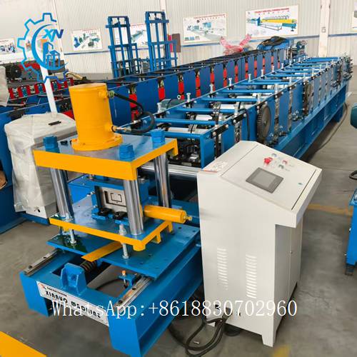C purlin roll forming machine is composed of feeding rack, feed import platform, leveling device, forming machine, punching device, flying saw cutting device, hydraulic station, computer control cabinet and so on. The c purlin finished by the machine has good bending resistance, good straightness, automatic long cutting, automatic punching, high automatization and convenient installation. Products can be used as the main body of large and medium-sized industrial and civil construction stress structure, such as factories, warehouses, engine garages, hangar, exhibition halls, theaters, sports venues, the market garden shed roof bearing load and metope.