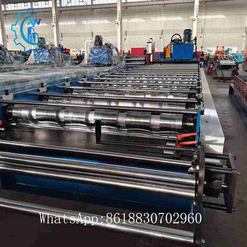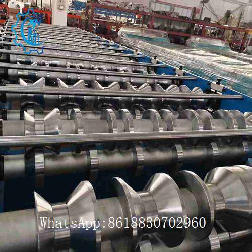 1).esta Conformadora de Chapa trapezoidal Detalles de la máquina de formación de chapas metálicas está compuesta por máquina de formación de rodillos, prensa de moldeo, máquina de corte, PLC, control por ordenador y sistema hidráulico.