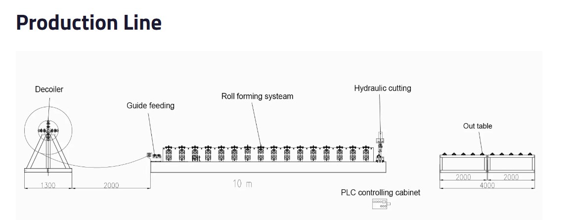 The roll forming process involves feeding a flat metal strip or coil into the machine, which then passes through a series of roller dies. These rollers gradually shape the metal into the desired trapezoidal profile by bending it along specific contours and forming the necessary flanges and ribs. The rollers are typically adjustable to achieve different profile dimensions and shapes.